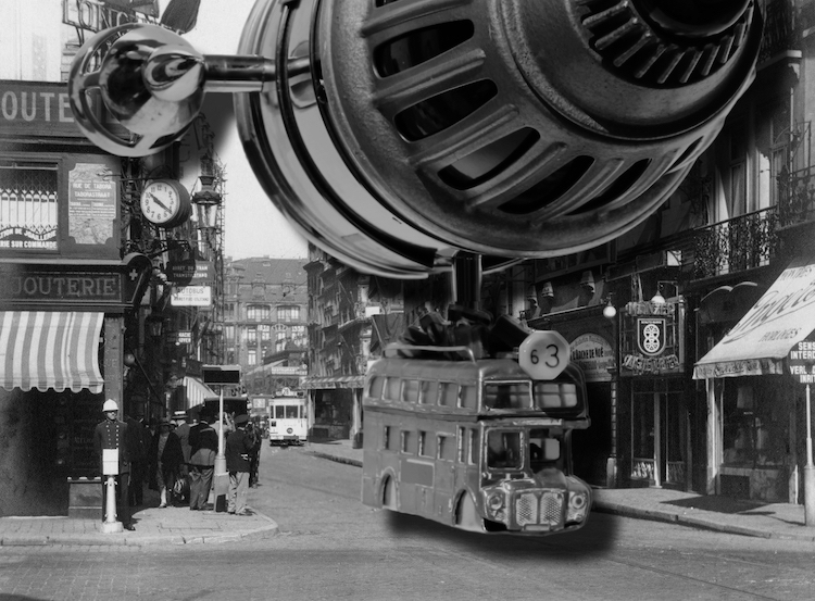 — This work was created, based on an original photo made in Brussels during the 1930ties. The photograph was made by the client’s grandmother. The original photo was the startingpoint for my investigation: when was the photo made? What tramcars were used? What movie was playing at the theatre on the right? How can I create a sort of tram that was visually attractive? I decided to create an alternative universe as the story above illustrates. I was able to find the film that was showing (Noah’s Ark) and provide this on a custom made USBstick, fitting the style of the work. —
